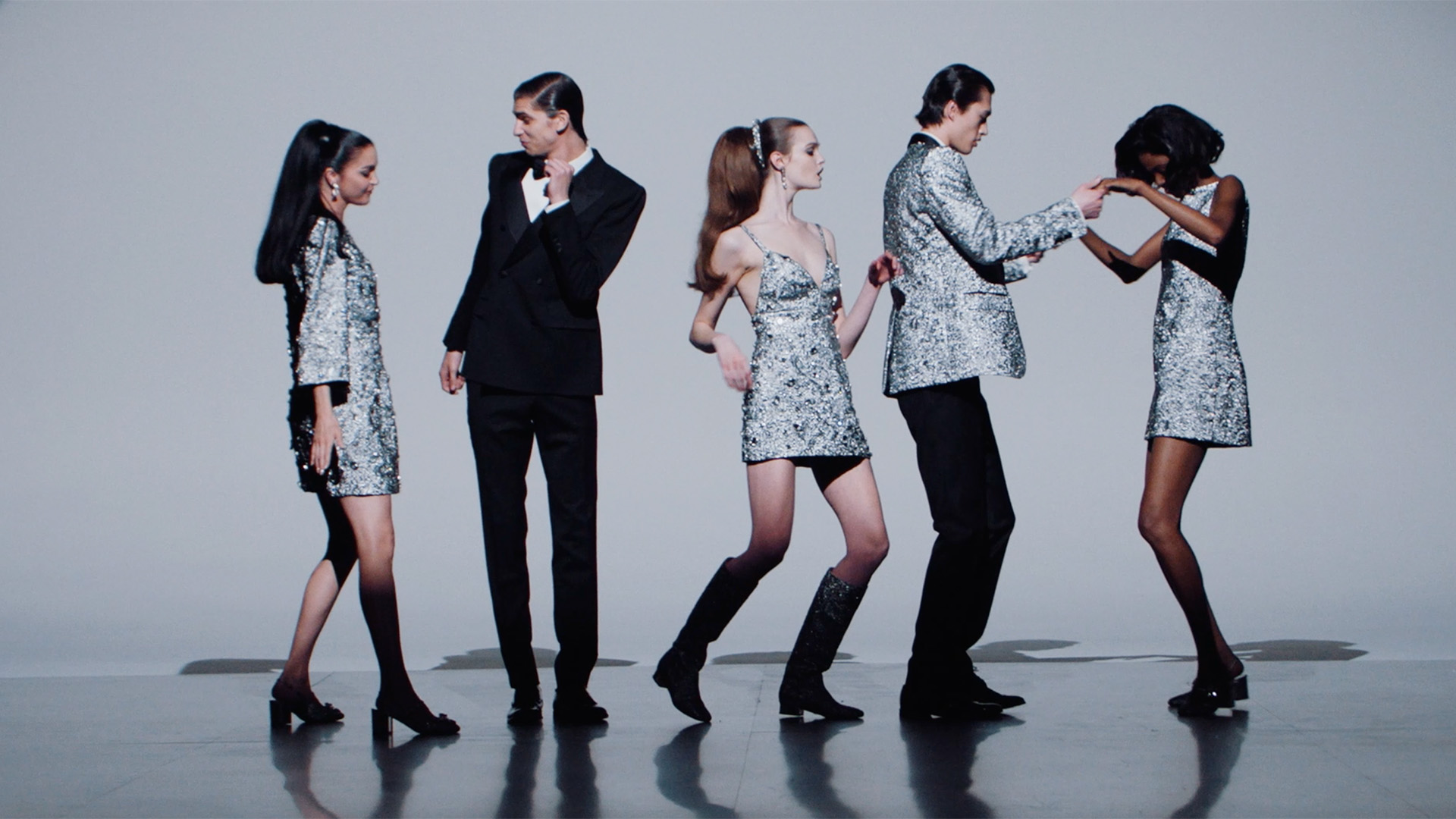 The echo of a bygone era converses with a contemporary approach, creating a balance between sophistication, spontaneity, and humor — a balance that finds its highest expression in the scenes where the models, including Lulu Tenney, Mariacarla Boscono, Victoria Fawole, Hedi Ben Tekaya, and Mathieu Simoneau, strike deliberately accentuated poses in homage to the era that inspired them, before gracefully twirling beneath the snow and the spotlight.