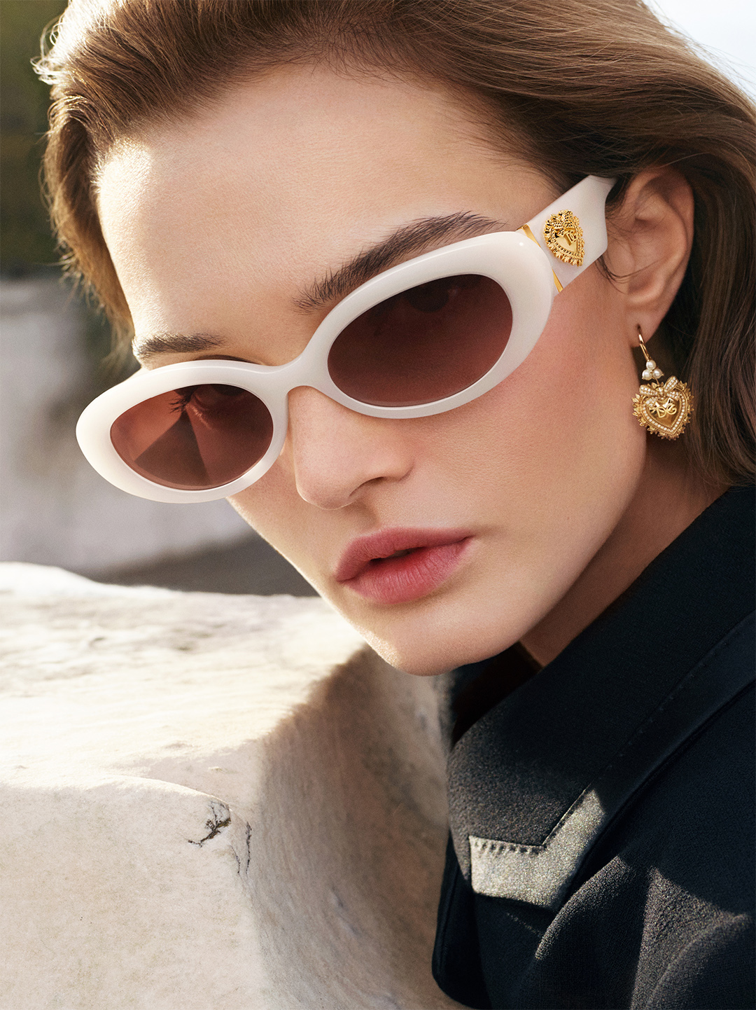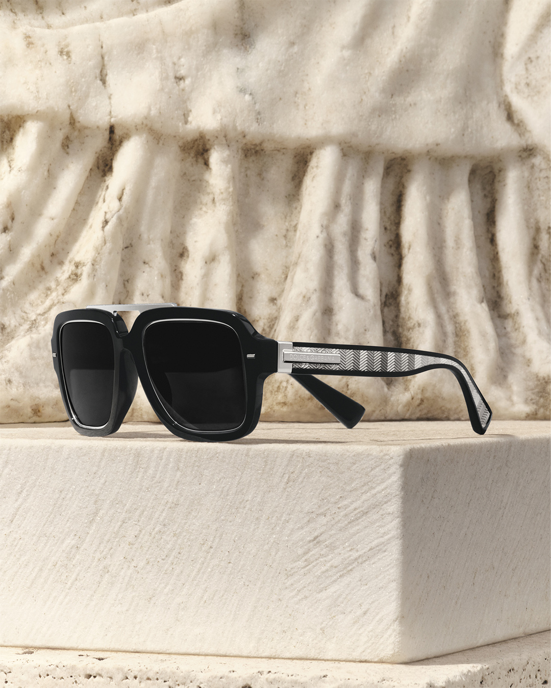 Dolce&Gabbana’s iconic codes are presented through a minimal, refined and sharply defined lens, highlighting the distinctive design of the Eyewear Collection. Among the key styles, Devotion for her—defined by sinuous lines and wide temples adorned with the Sacred Heart—and DG Divo for him, elevated by a subtle chevron motif engraved on gold-plated metal.